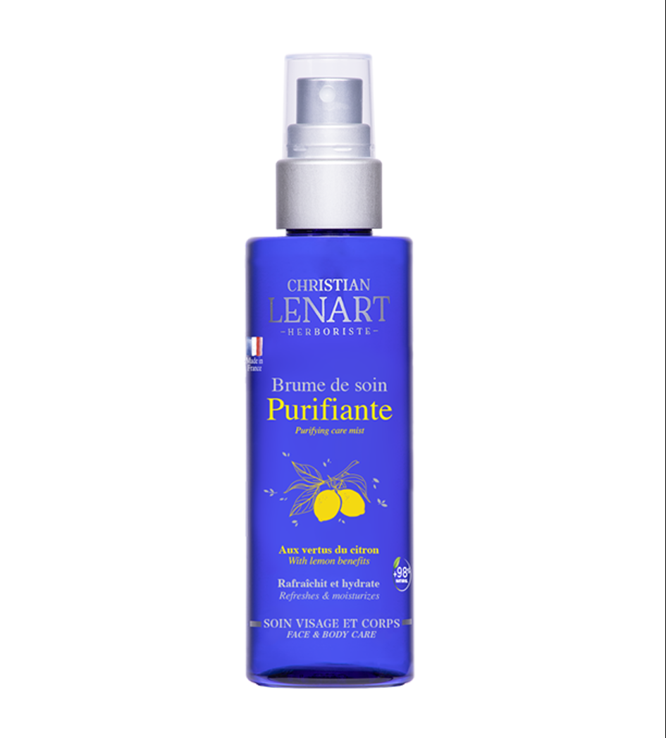 La brume de soin purifiante aux vertus du citron rafraîchit, hydrate et purifie la peau du visage et du corps le matin au réveil, le soir au coucher et tout au long de la journée.
